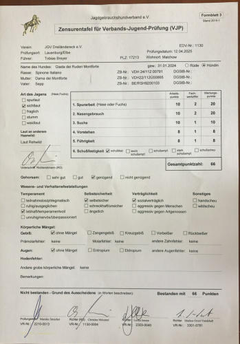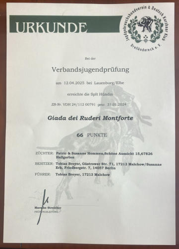 Aus unserem G Wurf hat Giada dei Ruderi Montforte die Verbands-Jugend-Prüfung VJP